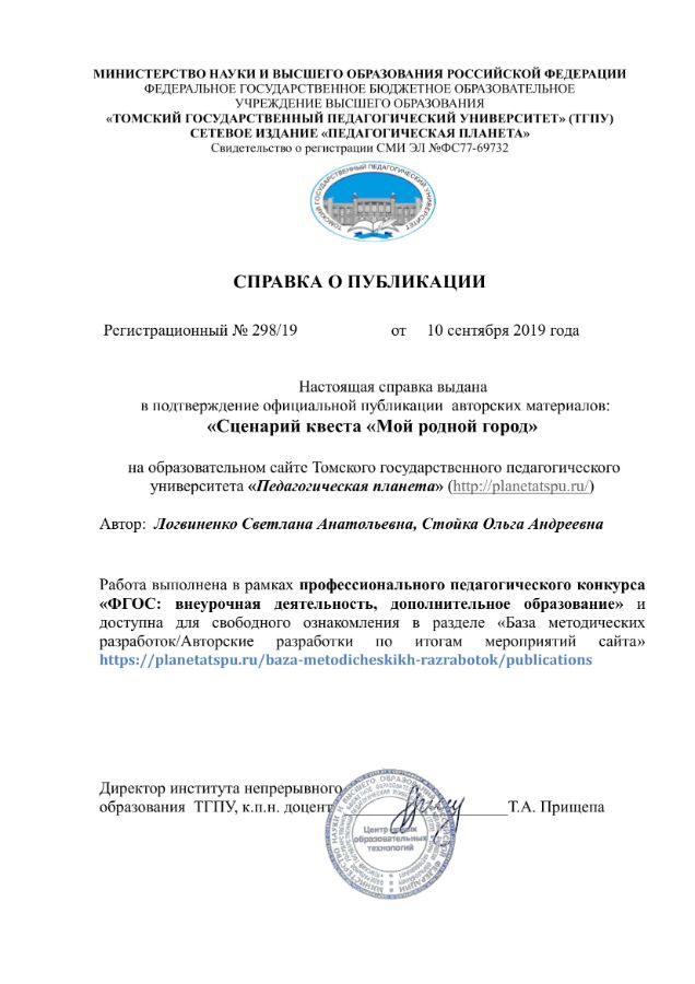 Публикация квеста совместной деятельности с детьми "Мой родной город" на сайте ТГПУ "Педагогическая планета" |