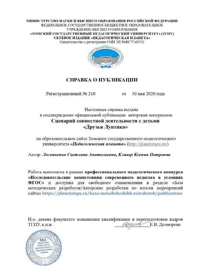 Публикация сценария совместной деятельности с детьми "Друзья Лунтика" на сайте ТГПУ "Педагогическая планета" |