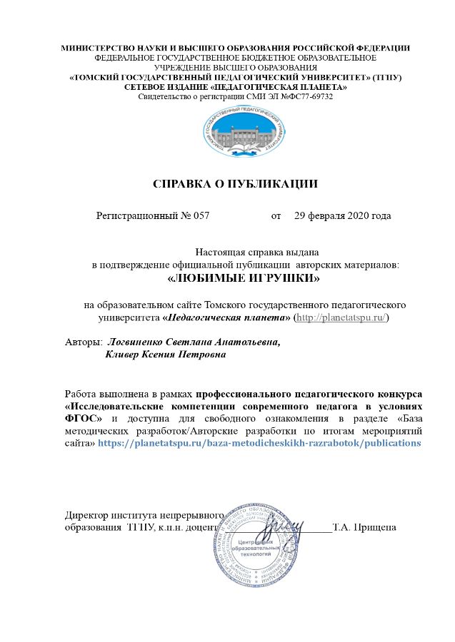 Публикация детского-взрослого проекта "Любимые игрушки" на сайте ТГПУ "Педагогическая планета" |