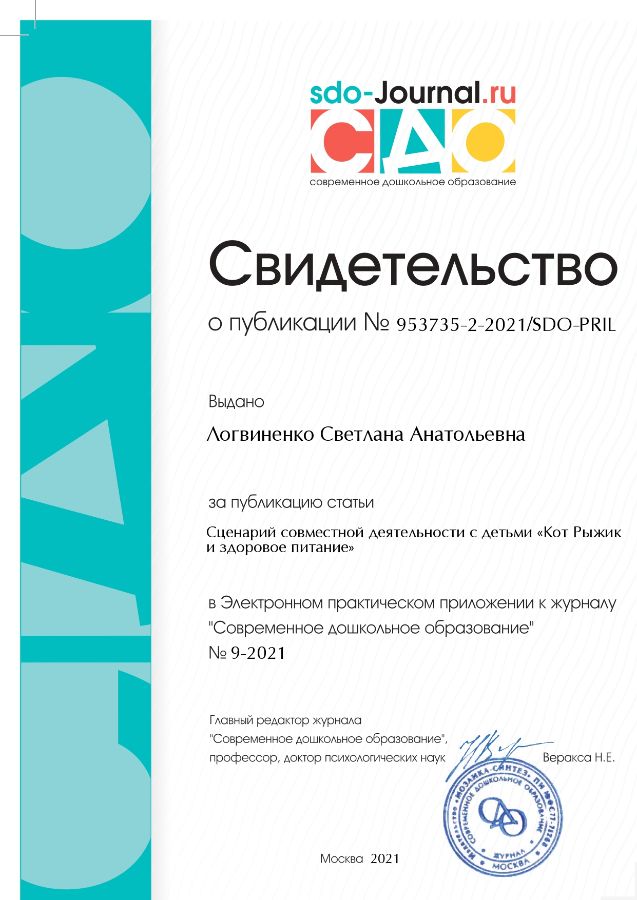 Публикация сценария совместной деятельности с детьми в Электронном практическом приложении к журналу "Современное дошкольное образование" №9 2021 |